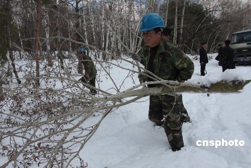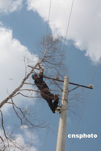 4月23日,當(dāng)牡丹江市電業(yè)搶修人員將三道林場(chǎng)內(nèi)最后一處電線桿上的刀閘閉合,7000多戶因暴雪導(dǎo)致斷電的人家,終于重新恢復(fù)正常的生產(chǎn)生活。 4月21日,黑龍江省牡丹江市出現(xiàn)雨夾雪天氣,其中牡丹江市三道林場(chǎng)的局部林區(qū)因當(dāng)?shù)亍靶夂颉庇绊懺馐鼙┭┮u擊,最深處的積雪厚度達(dá)到1米以上,林區(qū)內(nèi)的一些林木被大雪壓斷,通過林區(qū)內(nèi)的部分供電線路短路。從4月21日至4月23日,牡丹江市電業(yè)系統(tǒng)出動(dòng)100多名搶修人員奮戰(zhàn)在40多公里的林區(qū)供電線路上,及時(shí)排除短路故障及線路險(xiǎn)情。直到4月23日下午1點(diǎn)30分,各個(gè)停電村屯才陸續(xù)恢復(fù)供電。中新社發(fā) 莊文斌 攝