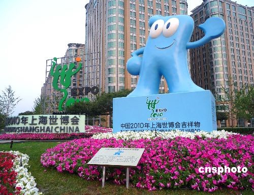 2009年4月28日,上海世博會(huì)吉祥物“海寶”花壇整體亮相北京東單路口處,迎接世博會(huì)倒計(jì)時(shí)一周年的到來,可愛的“海寶”吸引了過往行人的目光。2010年上海世博會(huì)吉祥物“海寶(HAIBAO)”,意為“四海之寶”,以藍(lán)色漢字的“人”作為核心創(chuàng)意,既反映了中國(guó)文化的特色,又呼應(yīng)了上海世博會(huì)會(huì)徽的設(shè)計(jì)理念。中新社發(fā) 玉龍 攝