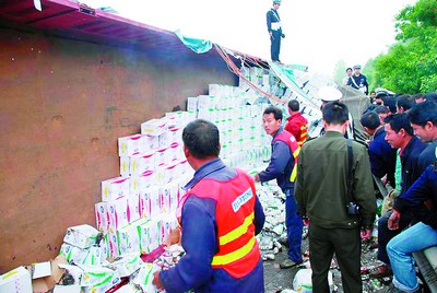 昨日(2日)上午8時,京珠高速臨長段由北往南方向125公里處,一輛裝滿牛奶的大貨車發(fā)生側(cè)翻,5000件牛奶傾覆一地。高速交警臨長大隊(duì)水渡河中隊(duì)接警后出動三個巡邏組,10余名民警趕赴現(xiàn)場維持秩序。