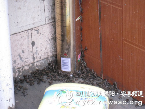 今日上午7點(diǎn),本網(wǎng)接到熱線反映,安縣桑棗鎮(zhèn)香溪村4組的席興國家周圍出現(xiàn)密密麻麻的蟾蜍,有上百萬只。9點(diǎn)過,當(dāng)記者敢到現(xiàn)場,只見席興國的房屋周圍以及隔壁鄰居家前前后后全布滿了小拇指般大小的灰黑色蟾蜍。除了壩子中間的蟾蜍比較稀疏外,路上、墻角等地比較陰暗的地方,出現(xiàn)蟾蜍蜂擁、扎堆現(xiàn)象。席興國指著被踩死的蟾蜍說:“根本沒法下腳,一腳下去就是十幾個。你看,我們走過的地方,都是蟾蜍的尸體。”
