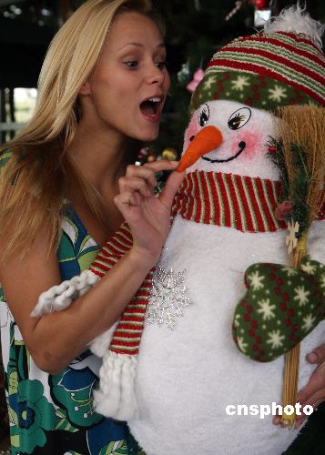 12月4日晚,正在廣東深圳參加第34屆國際比基尼小姐大賽的各國佳麗,來到灣區(qū)會(huì)館參加公益活動(dòng)。圖為一名佳麗在會(huì)館布置的圣誕雪人前拍照。中新社發(fā) 錢興強(qiáng) 攝