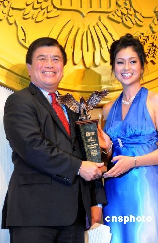 七月二十三日晚,國際領(lǐng)袖基金會(huì)在華盛頓舉行頒獎(jiǎng)晚會(huì),在美國國會(huì)中僅有的兩名華裔議員吳振偉、趙美心分別獲得“年度杰出公職服務(wù)獎(jiǎng)”。圖為美國首位華裔眾議員吳振偉領(lǐng)取“年度杰出公職服務(wù)獎(jiǎng)”。國際領(lǐng)袖基金會(huì)為全美最著名的亞裔青年領(lǐng)袖訓(xùn)練機(jī)構(gòu),每年定期表揚(yáng)促進(jìn)國際經(jīng)貿(mào)繁榮、發(fā)揚(yáng)中華文化傳承有卓越成就的杰出人士。中新社發(fā) 吳慶才 攝