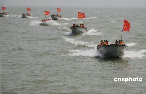 2009年6月13日,安徽巢湖預(yù)備役團(tuán)水上搶險(xiǎn)救災(zāi)分隊(duì)130余人攜12艘沖鋒舟在巢湖水面上擺兵布陣,進(jìn)行水上“S” 形穿越、水上越障、抗洪搶險(xiǎn)救災(zāi)、解救被困群眾、打撈救護(hù)、水上編隊(duì)等科目的實(shí)戰(zhàn)演練,以應(yīng)對(duì)大汛期間各類水上搜救。 中新社發(fā) 李遠(yuǎn)波 攝