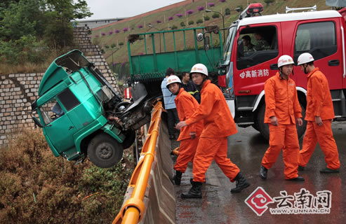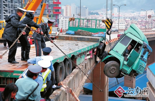 14日上午10時50分許,昆明市北二環(huán)通往黃土坡方向的小屯立交橋上層立交,上演了驚險一幕:一輛行駛在立交橋上的大型拖掛車突然撞上立交橋護欄,沖出立交橋外,車頭“懸掛”在離地面30多米高的護欄外。事故還造成3人被困駕駛室,經(jīng)過消防人員施救,3人在這次事故中死里逃生。