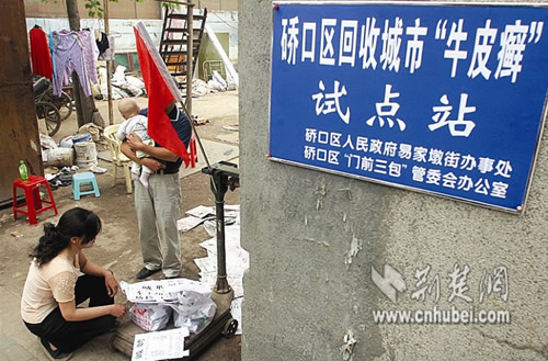 昨日(19日)上午,武漢市(湖北)硚口區(qū)易家墩街古三廢品回收站外,掛上“回收城市‘牛皮癬’試點(diǎn)站”的招牌,以高出普通廢紙2倍多的價(jià)格收購(gòu)“牛皮癬”,激發(fā)了不少居民的除“癬”熱情。