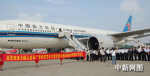 5月21日上午,廣西壯族自治區(qū)主席馬飚率領(lǐng)廣西經(jīng)貿(mào)文化代表團(tuán)乘坐包機(jī)從廣西南寧機(jī)場(chǎng)起飛,開始飛赴臺(tái)灣,廣西由此成為中國(guó)大陸各省、自治區(qū)、直轄市中第一個(gè)由省長(zhǎng)級(jí)官員率團(tuán)赴臺(tái)進(jìn)行經(jīng)貿(mào)文化交流的省份,此行也成為海峽兩岸交流史上的新突破。 馬飚率團(tuán)此行赴臺(tái)是參加“兩岸產(chǎn)業(yè)高峰會(huì)議——2009年桂臺(tái)經(jīng)貿(mào)合作論壇”,廣西經(jīng)貿(mào)文化代表團(tuán)人數(shù)多達(dá)1000余人,這也是大陸赴臺(tái)人數(shù)最多的參訪團(tuán)。劉萬(wàn)強(qiáng) 攝