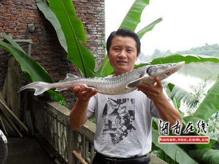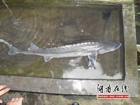 無獨(dú)有偶,5月24日早上6時許,在上堡水電站附近,李金鍵又遇到了一條外形一樣的魚!爱(dāng)時一村民提著一條受傷的魚叫賣。賣魚的村民稱也是卡在放水閘門里后被撈上來的。我瞧著那魚和前一天被卡死的魚一模一樣,便花40元把它買了回來。”李金鍵買下的這條“中華鱘”重約4斤,魚尾部位受傷嚴(yán)重。到家后,李金鍵趕緊向鄰居借了制氧機(jī)為其人工供氧,并撥打電話向耒陽市相關(guān)部門求助。