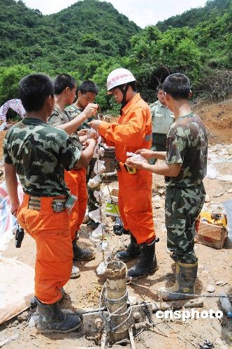 6月7日,發(fā)生塌方事故的三亞繞城高速公路隧道救援工作繼續(xù)緊張有序進(jìn)行。6月6日12時(shí)許,救援人員打通了一條通向被困人員所在處的補(bǔ)給通道,救援人員每隔三個(gè)小時(shí)左右給被困的8名施工人員進(jìn)行一次補(bǔ)給。目前,被困人員在隧道內(nèi)有充足的食物和飲用水,情緒穩(wěn)定,耐心等待救援。圖為7日13許,消防官兵通過(guò)補(bǔ)給通道給被困8名施工人員進(jìn)行第8次補(bǔ)給,補(bǔ)給的食物包括雞蛋、火腿腸、牛奶、“紅!憋嬃、小籠包,以及救援時(shí)將用到的防毒面具。中新社發(fā) 胡劍兵 攝
