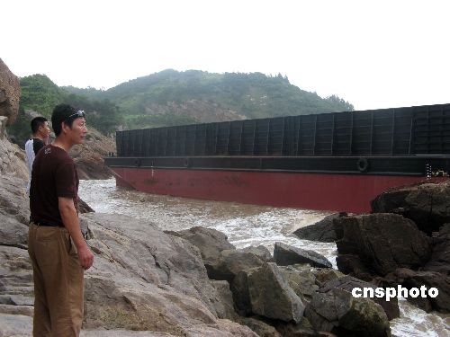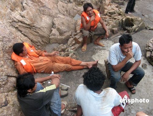 6月22日,受今年第3號熱帶風(fēng)暴“蓮花”外圍影響,印度尼西亞籍貨輪“永昌11號”在浙江洞頭海域避風(fēng)時遇險,后漂流到洞頭鹿西島,5名船員被當(dāng)?shù)剡叿烂窬、村民營救上岸。這艘遇險的外輪為駁船,船號為“永昌11號”,噸位為1000噸,其拖船為“LINTAS SAMUDERAXVI”,其駁船和拖船上共有10名船員,均為印度尼西亞籍船員。中新社發(fā) 蔡寬元 攝