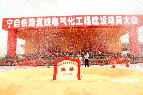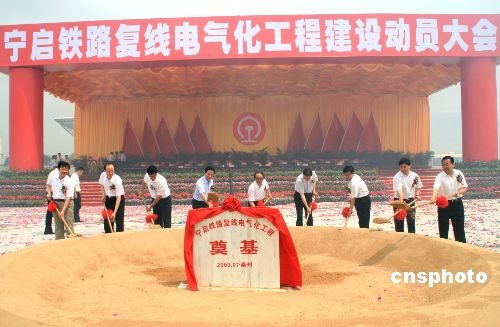 7月14日,寧啟鐵路復(fù)線電氣化工程建設(shè)動(dòng)員大會(huì)在江蘇省泰州市泰州火車站舉行。國家鐵道部部長(zhǎng)劉志軍、江蘇省委書記梁保華、省長(zhǎng)羅志軍,上海鐵路局局長(zhǎng)安路生以及泰州市委書記張雷等出席。寧啟線路全長(zhǎng)約268.3公里,項(xiàng)目總投資139億元,工期3年。建成后南京至南通運(yùn)行時(shí)間將從3小時(shí)50分縮短至1小時(shí)50分。圖為鐵道部、江蘇省有關(guān)領(lǐng)導(dǎo)共同為工程奠基。中新社發(fā) 崔佳明 攝