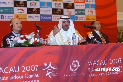 十月二十八日,亞奧理事會主席薩巴赫親王(中)在澳門第二屆亞洲室內(nèi)運動會記者會上,盛贊第二屆亞洲室內(nèi)運動會的組織工作非常成功,今后會更加成功。中新社發(fā) 史利 攝