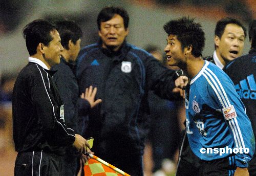 11月1日,2007中國足球超級聯(lián)賽第27輪在山東濟南的一場比賽中,主場作戰(zhàn)的山東魯能泰山隊1比1戰(zhàn)平大連實德足球隊。中新社發(fā) 張侃 攝
