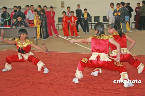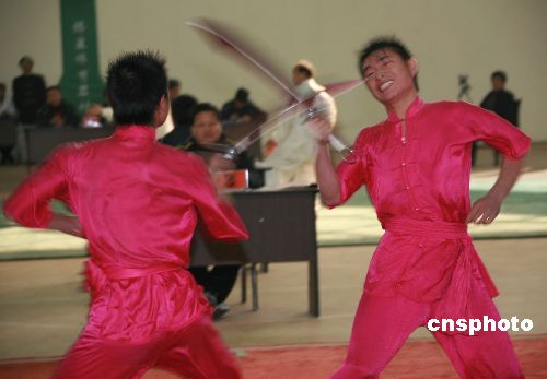 2007年11月19日,為期3天的“2007中國安徽首屆傳統(tǒng)武術(shù)大會暨武術(shù)套路國際邀請賽”在安徽省黃山市舉行。本次比賽分為傳統(tǒng)武術(shù)和武術(shù)套路兩個部分,其中有個人單項、個人全能比賽;有傳統(tǒng)拳術(shù)、傳統(tǒng)器械、對練3個項目。來自中國、美國、澳大利亞、波蘭、日本、新加坡、加蓬、越南、菲律賓、古巴和中國香港等十多個國家和地區(qū),共有43支代表隊的439名運動員參加比賽。中新社發(fā) 方也廣德 攝