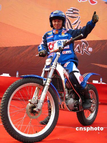 12月8日下午,中國首位摩托車手曹魯征戰(zhàn)2008年達(dá)喀爾拉力賽出征發(fā)車儀式在南京白馬公園舉行。今年30歲的曹魯曾先后獲得全國摩托車越野技巧賽冠軍、第二屆中國沙漠環(huán)塔拉力賽摩托車組總冠軍等榮譽(yù)。這次曹魯成為第一位摩托車手代表中國參加2008年1月5日發(fā)車的第30屆巴黎--達(dá)喀爾拉力賽,實(shí)現(xiàn)了他個(gè)人和中國摩托車界的夢想。中新社發(fā) 谷昌旺 攝