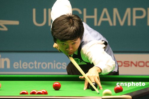 當(dāng)?shù)貢r(shí)間12月11日晚,中國(guó)“臺(tái)球神童”丁俊暉在英國(guó)的泰爾福德,以九比五力挫被戲稱為“00七”的奈吉爾·邦德,成功晉級(jí)斯諾克英國(guó)錦標(biāo)賽八強(qiáng)。中新社發(fā) 李鵬 攝