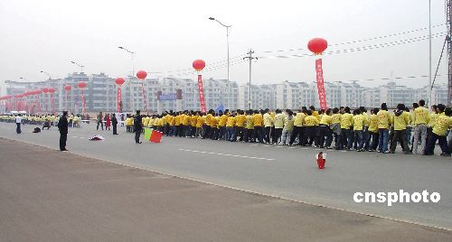 1月6日上午,湖南歷史上規(guī)模最大的拔河比賽在長(zhǎng)沙瀟湘大道舉行,共有3000多人參加,分成“新岳麓”隊(duì)和“新河西”隊(duì)。比賽用繩長(zhǎng)1008米,最粗處直徑0.1米,重達(dá)3噸,外層是白色的高強(qiáng)度聚丙烯纖維,里面的黑色材質(zhì)采用的是赫赫有名的“凱夫拉”纖維。最終,“新河西”隊(duì)獲勝。中新社發(fā) 肖前輝 攝