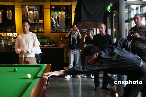 當(dāng)?shù)貢r(shí)間一月九日下午,中國(guó)“臺(tái)球神童”丁俊暉(擊球者)和香港名將傅家俊(穿白衣者)在倫敦唐人街的一間酒吧“過(guò)招”,推廣將在本月十三日開(kāi)始的溫布利大師賽。中新社發(fā) 李鵬 攝
