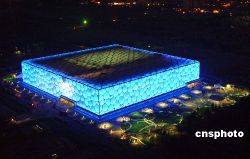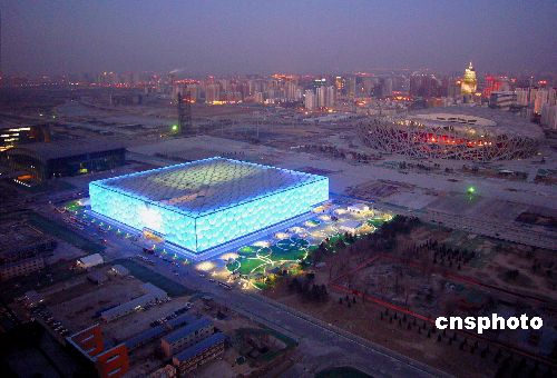 2008年1月31日傍晚,俯瞰“水立方”宛若一座美麗的“水晶宮” 晶瑩剔透,其冰清玉潔的芳姿令人陶醉。當(dāng)日,好運北京測試賽在此拉開帷幕。中新社發(fā) 玉龍 攝