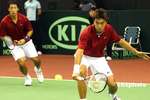2月9日,2008年戴維斯杯亞大區(qū)II組中國(guó)隊(duì)vs黎巴嫩隊(duì)比賽在北京國(guó)際網(wǎng)球中心進(jìn)行了第三場(chǎng)雙打比賽的較量。于欣源/曾少昡 以6:2,7:6(4),6:2戰(zhàn)勝黎巴嫩的吉桑·扎阿蒂尼/帕蒂克·楚克里雙打組合。盡管后兩場(chǎng)單打還沒(méi)進(jìn)行,中國(guó)隊(duì)總比分3:0已經(jīng)確保勝利晉級(jí)下輪。中新社發(fā) 富田 攝