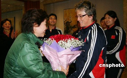 重慶市婦聯(lián)主席蘭運華向主教練伊麗莎白贈送鮮花。