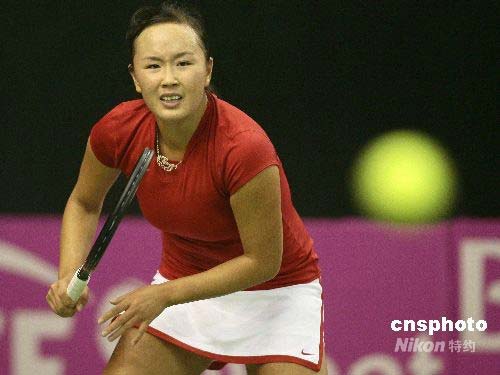 4月26日,聯(lián)合會杯網(wǎng)球賽世界杯半決賽中國隊與西班牙隊的比賽在北京國際網(wǎng)球中心進行。在首場單打比賽中,彭帥連輸兩盤以3-6,6(4)-7不敵年僅19歲的西班牙小將納瓦羅?偙确种袊0比1暫時落后。中新社發(fā) 富田 攝