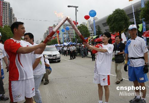 5月28日上午8時(shí),北京奧運(yùn)會火炬接力安徽的傳遞活動在合肥拉開帷幕。合肥籍世界跳水冠軍李娜擔(dān)任第一棒火炬手。圖為李娜將圣火傳遞給抗震勇士合肥市特警支隊(duì)的火炬手周世軍。中新社發(fā) 張婭子 攝