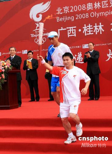 6月6日,北京奧運(yùn)圣火在廣西桂林傳遞,舉重奧運(yùn)冠軍唐靈生擔(dān)任第一棒火炬手。中新社發(fā) 周兆軍 攝