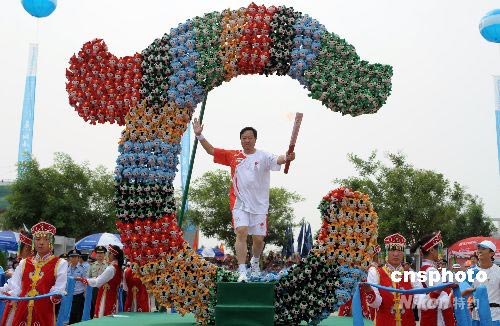 7月10日,奧運(yùn)火炬在內(nèi)蒙古赤峰市進(jìn)行傳遞。火炬手于建設(shè)穿過用福娃組成的“玉龍”。在赤峰翁牛特旗出土的紅山文化標(biāo)志性文物——玉龍,被史學(xué)界定為“中華第一龍”。中新社發(fā) 廖攀 攝