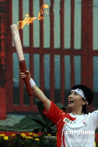 7月28日,中國中央電視臺新聞播音員李瑞英,作為河南安陽的第一棒火炬手,高舉北京奧運火炬開始安陽火炬?zhèn)鬟f。 中新社發(fā) 慎重 攝