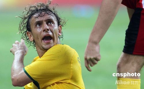 8月7日,北京奧運沈陽足球分賽場舉行男足預賽,巴西隊1:0勝比利時隊。圖為巴西球員RAFINHA怒對比利時犯規(guī)球員。中新社發(fā) 張宇 攝