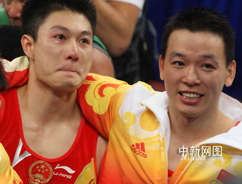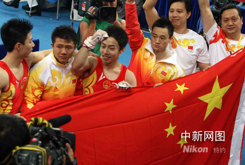 中國(guó)男子體操隊(duì)奪冠后合影。