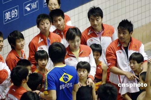 10月18日,奪得北京奧運(yùn)7金1銀3銅的中國(guó)跳水“夢(mèng)之隊(duì)”成員郭晶晶、吳敏霞、何沖等在福州給小跳水運(yùn)動(dòng)員傳授技藝。當(dāng)日,2008全國(guó)跳水錦標(biāo)賽在福建省體育中心游泳跳水館開賽。中新社發(fā) 王東明 攝