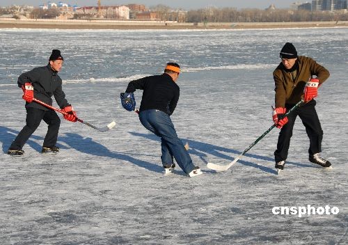 11月10日,黑龍江省黑河市冰上群眾體育活動啟動。黑河市勇士冰球隊隊員在封凍的中俄界河黑龍江上訓(xùn)練。中新社發(fā) 邱齊龍 攝