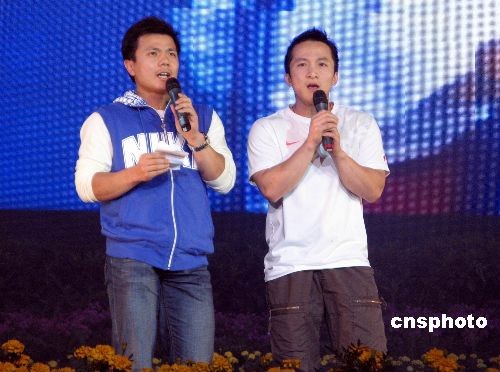 11月17日晚,在“客家祖地”福建龍巖舉行的第五屆中國龍巖投資項(xiàng)目洽談會(huì)文藝晚會(huì)上,福建龍巖籍奧運(yùn)冠軍張湘祥、石智勇同臺(tái)為海內(nèi)外鄉(xiāng)親深情演繹一曲《朋友》。中新社發(fā) 張彩林 攝