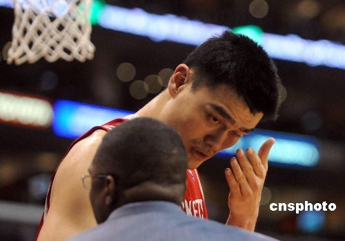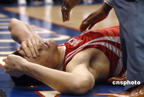 當(dāng)?shù)貢r間十二月十三日晚,NBA休斯敦火箭隊(duì)在洛杉磯客場挑戰(zhàn)洛杉磯快船隊(duì),結(jié)果以八十二比九十五失利。第三節(jié)開始不久,姚明左眼被擊中后痛苦倒地,被迫暫時離場醫(yī)治,幾分鐘后姚明重新上場。但此后,火箭隊(duì)被逆轉(zhuǎn),最終失利。中新社發(fā) 張煒 攝