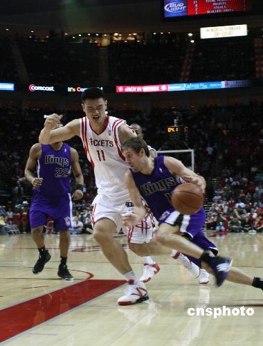 當(dāng)?shù)貢r(shí)間2月11日,火箭隊(duì)在休斯頓豐田中心以94-82擊敗阿帥舊部——聯(lián)盟倒數(shù)第一的國王,贏得了全明星賽前的最后一場比賽。姚明全場貢獻(xiàn)了24分18個(gè)籃板,均為全場最高。中新社發(fā) 歐文 攝