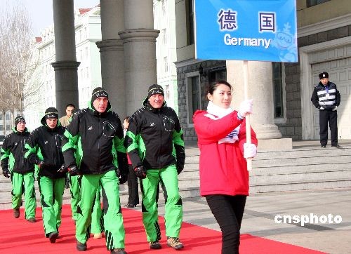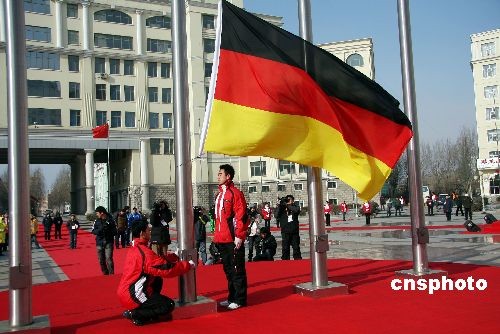 2月14日上午10時(shí),第24屆世界大學(xué)生冬季運(yùn)動(dòng)會(huì)德國(guó)體育代表團(tuán)歡迎儀式暨德國(guó)體育代表團(tuán)升旗儀式在黑龍江大學(xué)大運(yùn)村升旗廣場(chǎng)舉行。大運(yùn)村執(zhí)行村長(zhǎng)張政文、村長(zhǎng)助理張曉光以及德國(guó)代表團(tuán)團(tuán)長(zhǎng)羅蘭·約希姆一行6人出席了此次歡迎儀式。這是大運(yùn)村首次為國(guó)外代表團(tuán)舉行的歡迎儀式。中新社發(fā) 姚庭山 攝