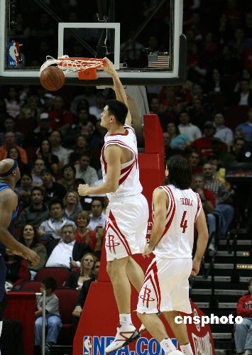 當(dāng)?shù)貢r(shí)間二月二十日晚,NBA火箭隊(duì)在休斯頓主場迎戰(zhàn)小牛隊(duì),以93比86逆轉(zhuǎn)獲勝。中國球員姚明拿下了22分13個(gè)籃板。圖為姚明扣籃得分。中新社發(fā) 歐文 攝