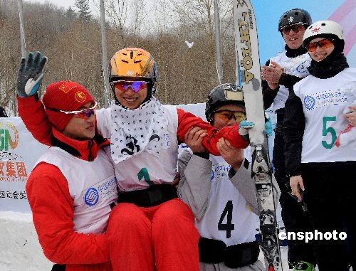 2月24日,第24屆世界大學(xué)生冬季運(yùn)動(dòng)會(huì)在哈爾濱亞布力滑雪場(chǎng)進(jìn)行自由式滑雪空中技巧混合團(tuán)體賽。中國隊(duì)派出男女個(gè)人賽的冠軍賈宗洋和李妮娜以及男隊(duì)的劉忠慶三人出戰(zhàn),三人均完美地完成動(dòng)作,最終以總分335.24獲得冠軍。 中新社發(fā) 鄭宇鈞 攝