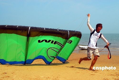 3月19日,為期兩天的“2009海口帆板暨風箏沖浪邀請賽”在?谑形餍愫╅_幕。這是我國首次舉辦國際性風箏沖浪大賽。比賽設公開級風箏沖浪場地賽、風箏沖浪自由花式賽、公開級帆板場地賽和特邀組帆板場地賽等多個項目。中新社發(fā) 善平 攝