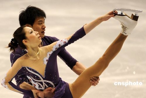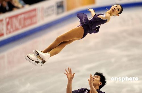 當(dāng)?shù)貢r間三月二十五日晚,在二00九年花樣滑冰世界錦標(biāo)賽雙人滑決賽中,中國選手張丹/張昊獲得亞軍。中新社發(fā) 張煒 攝