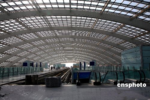 2007年11月6日,北京首都機場輕軌“3號航站樓站”接近尾聲,該車站位于首都機場3號航站樓前的交通中心內(nèi),旅客可通過扶梯直達3號航站樓。機場線全長28.1公里,自西向東共設置了4座車站,起點站——“東直門站”與地鐵2號線和13號線互為換乘站,另外還包括三元橋站(與10號線互為換乘站)和“2號航站樓站”(位于2號航站樓與停車樓之間的綠地及現(xiàn)狀道路之下,旅客可經(jīng)通道直達2號航站樓)。該工程預計2008年4月建成,7月1日開始載客試運營。屆時,機場輕軌最高運營速度100公里/小時,東直門至首都機場運行時間為16分鐘。中新社發(fā) 洪濤 攝