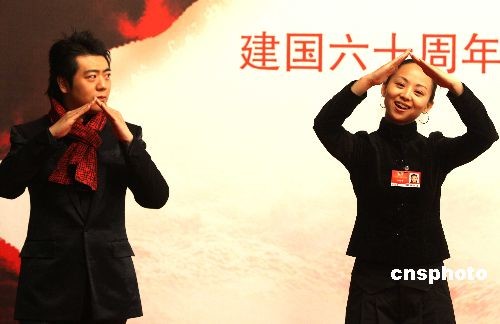 3月8日,建國(guó)60周年獻(xiàn)禮歌曲《國(guó)家》在北京舉行MV開(kāi)機(jī)儀式,鋼琴演奏家郎朗、《千手觀音》表演者邰麗華出席儀式。圖為邰麗華(右)用手語(yǔ)演繹歌詞,并現(xiàn)場(chǎng)教授郎朗。中新社發(fā) 張宇 攝