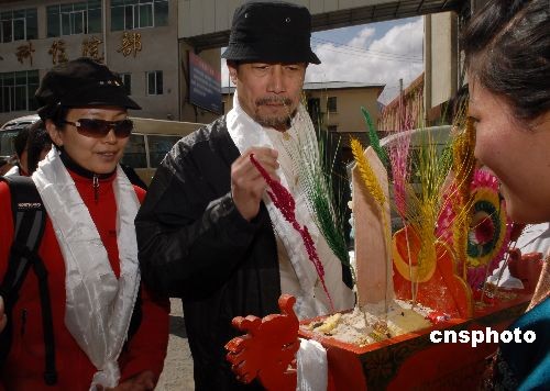 3月24日,孫海英、呂麗萍夫婦受邀參加“5.12中國(guó)愛(ài)——中國(guó)嬌子愛(ài)心行動(dòng)”,在西藏進(jìn)行一系列愛(ài)心公益活動(dòng)。抵達(dá)西藏,孫海英、呂麗萍夫婦受到當(dāng)?shù)孛癖姷臍g迎,藏族美女給孫海英敬上了大碗青稞酒。中新社發(fā) 龍昊 攝