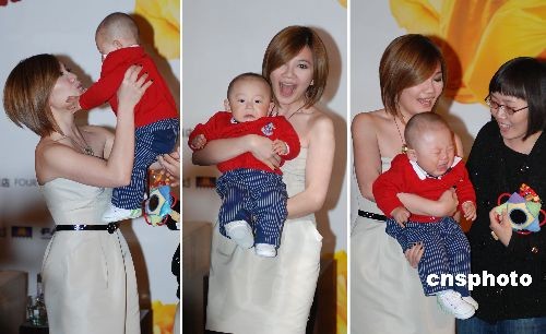 4月20日,馬來西亞“情歌天后”梁靜茹亮相北京,出席將于5月27號舉辦的“2009梁靜茹今天情人節(jié)北京演唱會”發(fā)布會。 在梁靜茹2005年北京演唱會上,有一位男孩在梁靜茹的鼓勵下向愛人求婚,終成連理。前不久,他們的寶寶出世。發(fā)布會當日,一家三口特別來到現(xiàn)場為梁靜茹加油。而他們的寶寶也成為梁靜茹年齡最小的“粉絲”。圖為梁靜茹抱起小“粉絲”,十分開心。中新社發(fā) 李學(xué)仕 攝