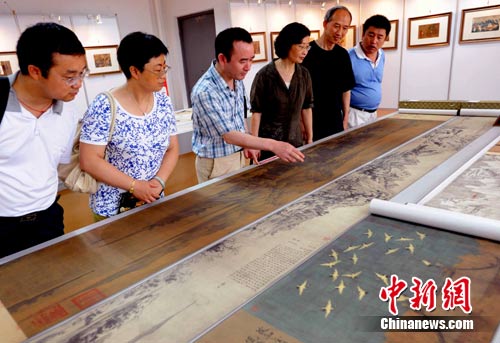 7月8日,觀眾在福州舉辦的“兩岸故宮高仿真宮廷畫聯(lián)展”上被展出的一幅合璧版仿真《富春山居圖》所深深吸引!陡淮荷骄訄D》是元朝畫家黃公望的代表作,是其為無用師和尚所繪,以浙江富春江為背景,全圖用墨淡雅,山和水的布置疏密得當(dāng),墨色濃淡干濕并用,極富變化,被譽(yù)為中國十大傳世名畫之一,其流傳經(jīng)歷充滿傳奇色彩,目前兩岸各存一段。據(jù)了解,此次“兩岸故宮高仿真宮廷畫聯(lián)展”共展出130余件高仿真作品,囊括了隋唐五代、宋、元、明、清和近代各個(gè)時(shí)期書畫名家的傳世佳作。