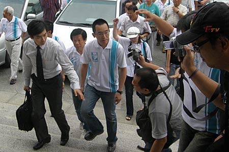 陳致中(前左 2)被《壹周刊》爆料疑涉召妓。陳致中26日由律師陪同到高雄地方法院提出民事告訴,向《壹周刊》求償新臺(tái)幣200萬元。 圖片來源:“中央社”