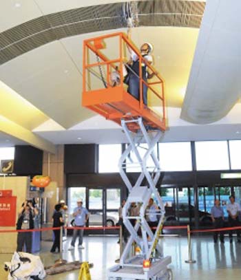 臺灣民航部門接到通報,要挖土機立即停工,調(diào)來升降車升高到屋頂,拆卸部分鋼柵欄,取出更多更大的混凝土碎塊。另外機電廠商人員也爬上天花板會勘,發(fā)現(xiàn)天花板上方的空調(diào)及消防管路遭到破壞,并出現(xiàn)漏水情形。