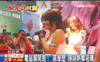 據(jù)臺(tái)灣TVBS電視臺(tái)報(bào)道,臺(tái)北計(jì)算機(jī)展大會(huì)舞臺(tái)還沒(méi)開(kāi)鑼,參展廠商就派巧克力膚色辣妹開(kāi)始搏版面,沒(méi)有舞臺(tái)就在展場(chǎng)地毯展現(xiàn)動(dòng)感。有的廠商由于和隔壁搞競(jìng)爭(zhēng)搶眼球,上午11點(diǎn)半的Show Gilr表演,足足提早1小時(shí)。