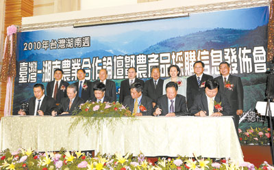 8月6日上午,在臺(tái)南走馬瀨農(nóng)場(chǎng)舉行了“臺(tái)灣-湖南農(nóng)業(yè)合作論壇暨農(nóng)產(chǎn)品采購(gòu)信息發(fā)布會(huì)”。湘臺(tái)農(nóng)業(yè)界人士200余人參加了洽談會(huì)。臺(tái)灣海峽兩岸農(nóng)業(yè)協(xié)會(huì)與湖南省農(nóng)業(yè)產(chǎn)業(yè)協(xié)會(huì)簽訂了“湘臺(tái)農(nóng)業(yè)合作備忘錄”;湘臺(tái)相關(guān)企業(yè)簽訂了“臺(tái)灣茶葉采購(gòu)意向書”、“臺(tái)灣水產(chǎn)品、水果等農(nóng)產(chǎn)品采購(gòu)合作意向書”、“臺(tái)灣食品采購(gòu)合同”、在湖南各大超市設(shè)立“苗栗縣卓蘭鎮(zhèn)水果專柜”合作意向;湖南省供銷合作社發(fā)布了農(nóng)產(chǎn)品采購(gòu)信息。兩地農(nóng)業(yè)界表示將攜手合作,取長(zhǎng)補(bǔ)短,推動(dòng)兩地農(nóng)業(yè)共同發(fā)展。